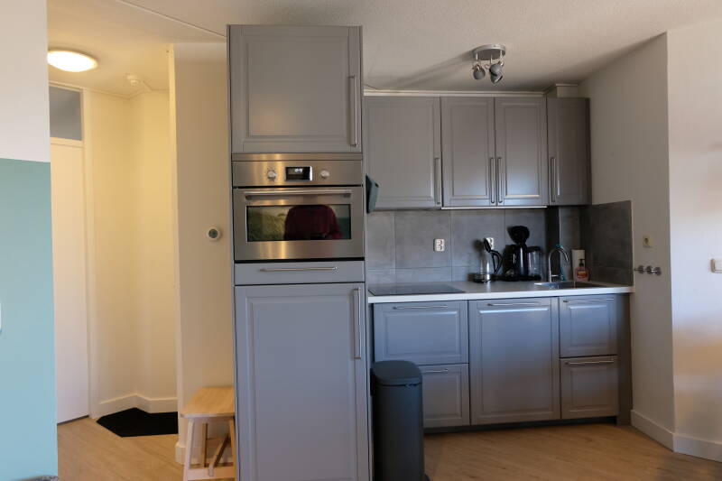 De woonkamer is voorzien van een zithoek met tv en een eethoek. De moderne open keuken beschikt is compleet ingericht met koelkast incl. vriesvak, Combi-magnetron, inductiekookplaat, vaatwasser, waterkoker, koffiezetapparaat en Senseoapparaat.