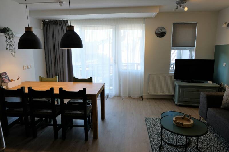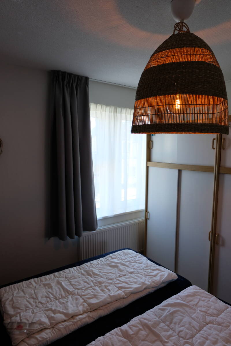 Het appartement heeft twee slaapkamers met ieder 2 éénpersoons bedden. De badkamer is voorzien van een douche, toilet en wastafel, er is tevens een wasmachine aanwezig. Het balkon met tafel en stoelen bevindt zich aan de westzijde van het appartement met lekker veel avondzon, vanuit hier kun je zelfs de zee horen!